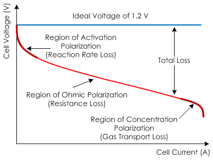Unfortunately, it is hard to maintain a high fuel cell voltage under current load. The voltage output of a real fuel cell is less than the thermodynamically predicted voltage output due to irreversible losses. The more current that is drawn from the cell, the greater these losses.