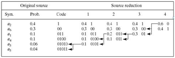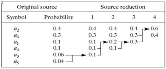 - Source reductions: Create a series of source reductions by ordering the probabilities of the symbols and then combine the symbols of lowest probability to form new symbols recursively.