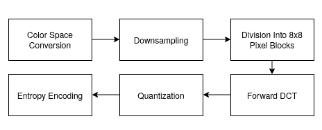 - Color Space Conversion: The image is converted from RGB to YCbCr, separating brightness (Y) from color (Cb, Cr). This allows more compression on color data, which the human eye is less sensitive to.