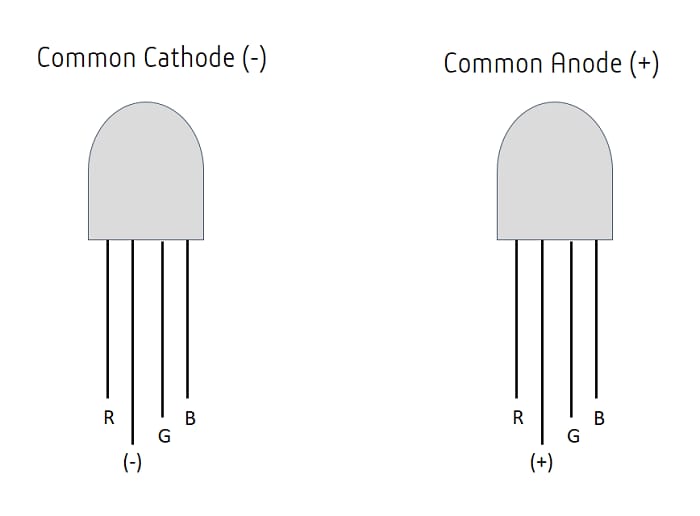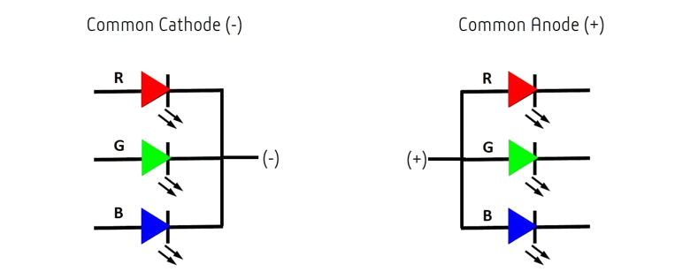 In a Common Cathode RGB LED, all three individual LEDs (Red, Green, and Blue) share a common negative connection, also known as the cathode. Conversely, in a Common Anode RGB LED, these LEDs share a common positive connection, known as the anode. The choice between common cathode and common anode configurations depends on the specific requirements of the circuit or application.