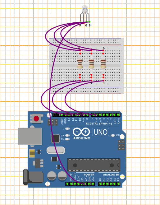 A circuit with an Arduino Uno, a common cathode RGB LED, and resistors (*Ballast resistors) is commonly used. The cathode is connected to ground, and the anodes are connected to digital pins through resistors.